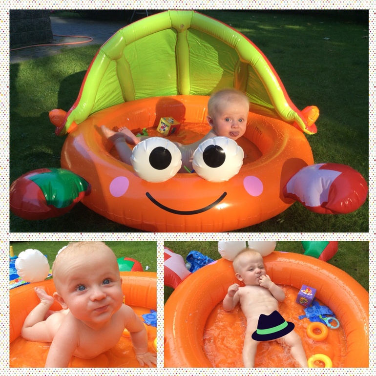 Купается днем в бассейне. Купаться может долго... С тех пор как стал купаться в бассейне, перестал плавать в круге и на руках в ванной. Теперь только на пузе туда-сюда "плавает" по дну.