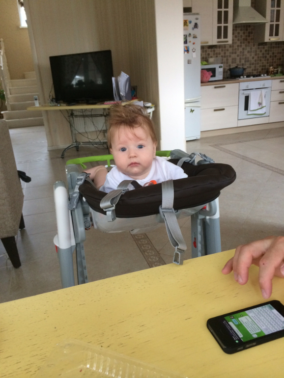 Развивашки: особо впечатляющих в этом месяце нет, но все же: лежа на животе может отрывать локотки опираясь на ладошки, еще немного и думаю скоро встанет на четвереньки , тк может уже давно вставать на коленочки , но ручки и головка при этом лежат на поверхности. Новое умелка это когда держу его на ручках и папа подходит и говорит иди ко мне ( манит его) то Макс тянет ручки и его торс наклоняется в сторону папы , и соответственно если деть на руках у папы то тянется ко мне.