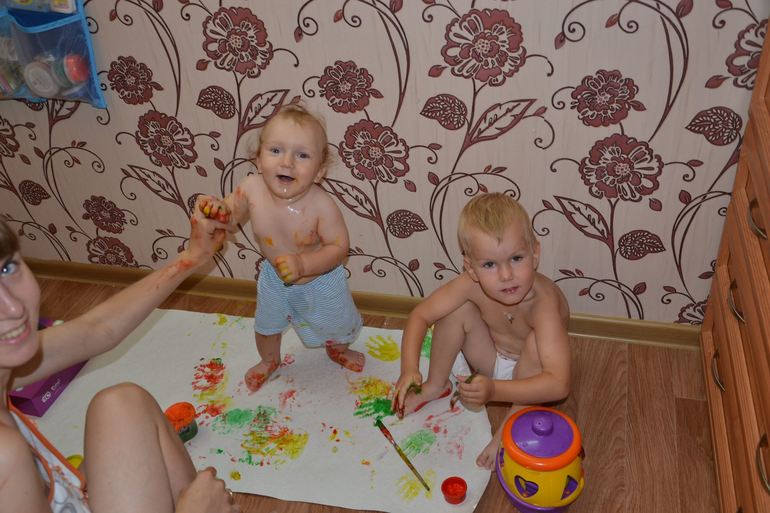 Еще у нас состоялось наше первое знакомство с красками и пластилином. Краски Венюшке понравились. Первый раз он изрисовал все себя и бумагу, и пол. Вчера рисовали второй раз. Это было знакомство с кисточкой. Он не хотел, чтобы рисовали на его ладошках, за то упорно макал кисточкой в баночки с красками, доставая то один цвет, то другой и это его очень увлекло.