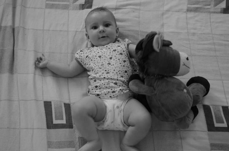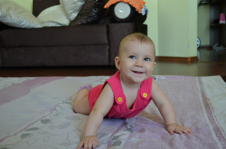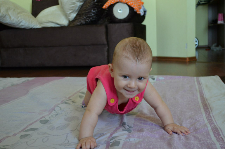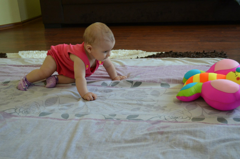 Про ползание. Софийка уже лучше ползает, в прошлом месяце она просто лежала и поднимала попку, недельки три назад научилась стоять на четвереньках, недели две назад начала раскачиваться, а потом начала раскачиваться и прыгать и иногда даже было ей больно. А сейчас уже передвигает ножки и ручки синхронно. Доползает до мебели и удоряется головкой, и потом очень жалобно плачет, бедняжка! Ведь это только начало, дальше будет учиться ходить, там шишки набивать наверное будет и больнее и чаще ((.