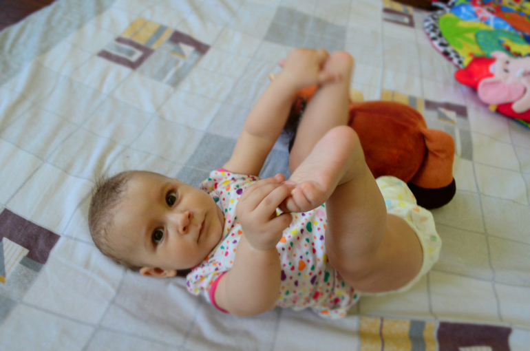 Про сон. Спит ночью нормально, а вот днем только на мне или со мной. Спать укладываю ее только укачиванием , не знаю как дальше будет, но я до сих пор качаю дочу на фитболе. Сейчас мне так удобно. Софи крутится и вертится во сне, ползает и кряхтит. Спит без одеяла, если укрою то раскрывается и опять в исходную позу сна.