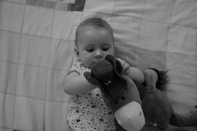 Про наблюдательность. Софиюшка стала ооочень внимательно следить за окружающей средой, деревья, вода, ветер (особенно нравиться ей, когда теплый ветерок дует Софи улыбается), дети, особенно постарше которые уже бегают и кричат. Любит животных, тсобенно собак, кошки не даются ей в руки. Любит трогать собачек и очень громко при этом смеется. Наблюдает уже не за нашим передвижением а за дейсвиями. Когда пьем чай на полу, разглядывает все предметы, потом ползет к ним целенаправленно. Когда сидим играем карты, доча подползает, начинает перебирать и мять карты, а когда зовешь ее она ехидно смотрит и смеется! И ваще! Игрушки это вчерашний день, сегодня нам нужны пульты, телефоны, тапки, заколки, резинки, ножки от кресел, короч все что найдется на полу. Ездить в коляске полу лежа тоже уже не интересно, пытается вылезти, сесть, но пока доча не сидит, так что пока только второе положение.