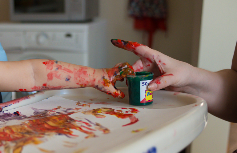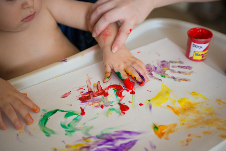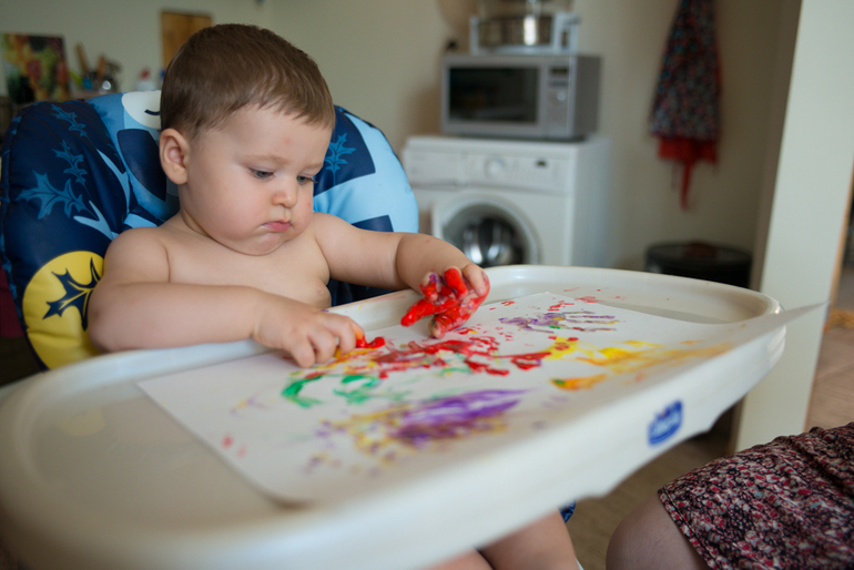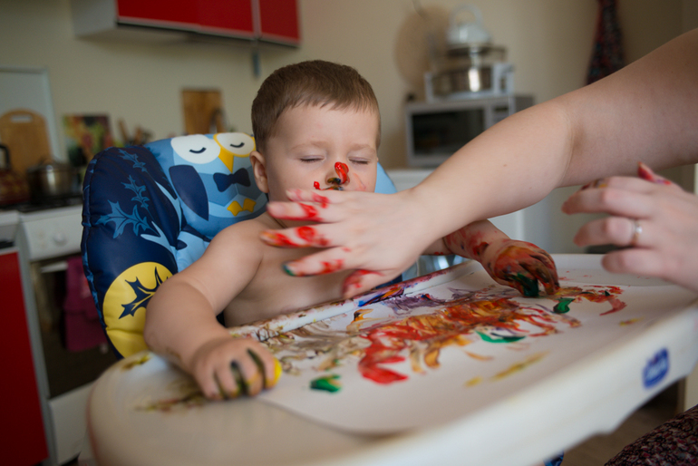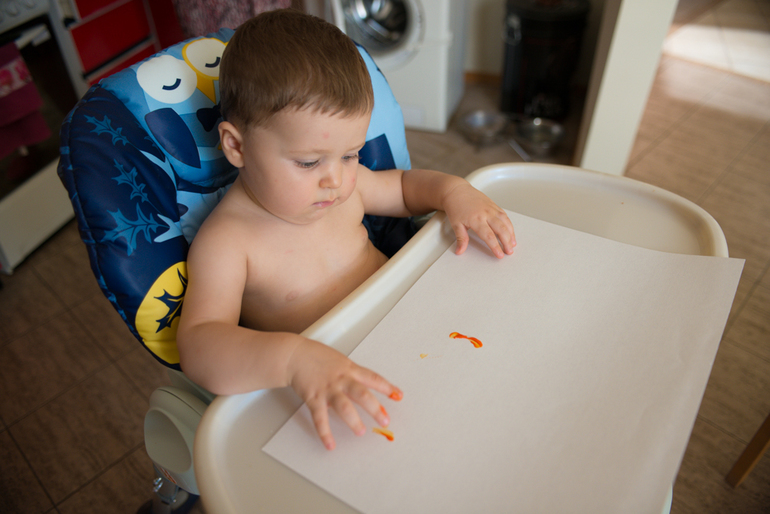 Открываем первую банку, оранжевую. Окунаем пальцы, показываем как рисовать, но Андрей явно не понимает что с этим делать: