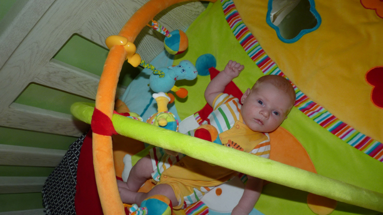 Из новенького: очень активно болтает "ГУ", "Ааааии", "УУУУ" . Очень любит, когда с ним разговаривают. Стал очень осознанно смотреть на лица, игрушки (четко за ними следит). Коврик и мобиль не очень любит, а вот кресло чикко и слинг по прежнему уважает. Вообще очень серъезный малыш: не улыбается, по пустякам не плачет, стоически переносит всякие неприятные перевязки с пупком.