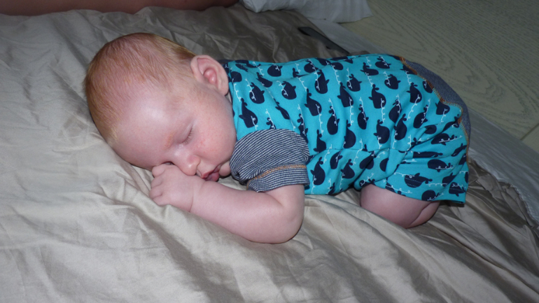 Спит днем по долгу только на животе или слинге\на руках - в коляске на спине сразу просыпается, вообще не знаю как в холода гулять будем. Ночью спит с 23 до 5 утра со мной в обнимочку- с ним очень уж сладко спится, может и в кровати бы спал, да я сама не хочу перекладывать.