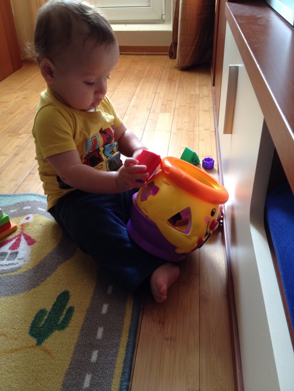 Вообще сортеров у нас несколько. Самый полюбившийся вот этот, хотя он дико сложный, я сама туда еле засовываю детальки.Зато, когда в него все забрасываешь через верх, он весело поет, что как раз Артуру и нравится