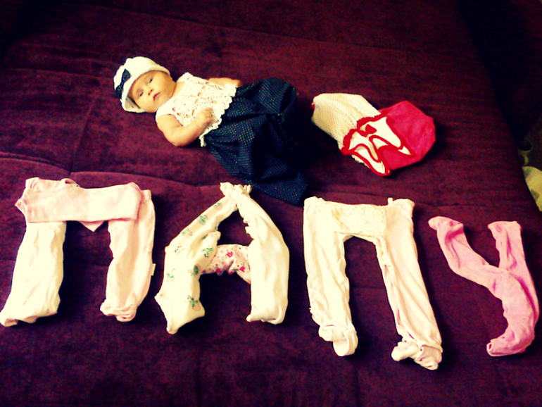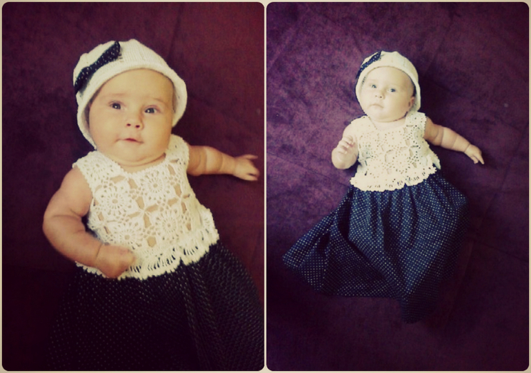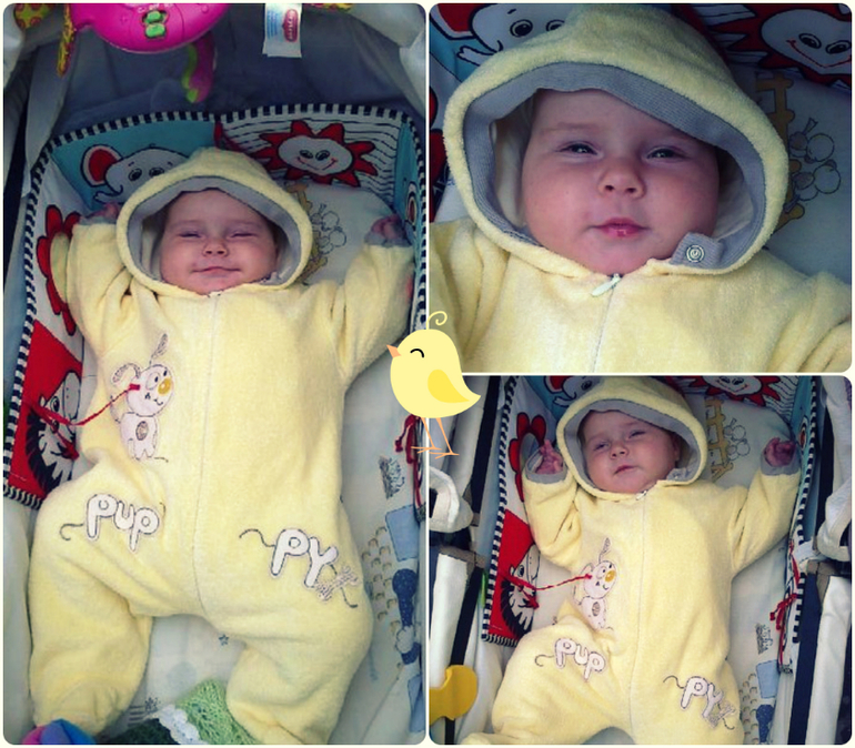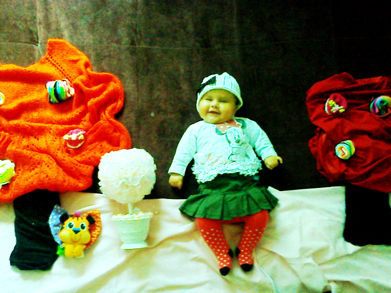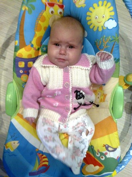 Настюшка растет очень доброй и веселой, почти всегда улыбается, людей на свои-чужие не разделяет почти, улыбается всем, кто улыбнется ей. Растет как на дрожжах - недавно достали уже 68 размер!