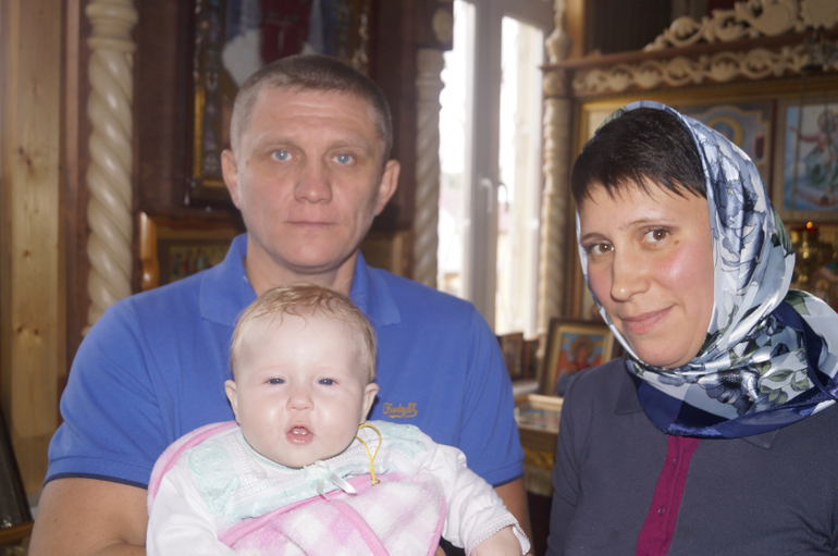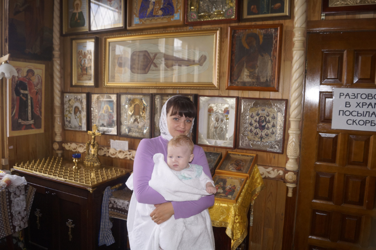Хорошо хоть не было дождя. Но было пасмурно и неуютно. Крестить нас начали в двенадцатом часу. Мышка держалась стойко. Поплакала только когда кушать захотела да когда окунали в купель. Нас с папой сначала не пустили. Пригласили уже в конце обряда. А мне очень хотелось быть там. Мы ходили за закрытыми дверями как 2 тигра, которые не могут себе места найти, переживая за маленького тигрёнка. Хорошо, что муж подруги согласился снимать весь обряд на камеру. И по приезду домой мы все вместе посмотрели запись и много смеялись над интересными моментами. Крестили Викульку с золотым крестиком, который подарила крёстная мать. Дома перед сном переодели её в серебряный, освещённый в церкви. Будет ходить в нём пока немного не подрастёт. Все друзья захотели и свои крестики освятить у этого батюшки. А так же освятили 2 иконы, которые я вышивала бисером - одну для себя, а другую я подарила другу мужа на день рождения. И вот.... покрестили Викульку. Выходим на улицу и О, чудо!!!! светит солнце и идёт дождь. Пока мы ждали крещения, немного проветрило дорогу. И обратно к машинам прошли намного быстрее и легче. Но под дождиком. Батюшка сказал, что мы сделали богоугодное дело - покрестили малыша. Это очень хорошо . Поэтому и погода дождь с солнцем .)))) А по приезду , конечно, было небольшое застолье. )))