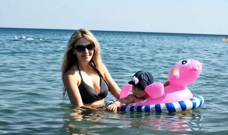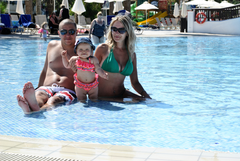 вечерами мы ходили гулять на набережную, сидели у моря, ходили в клуб и т.д. Кира была в восторге от воды. от моря, много купалась, загорала, ей все кругом было интересно! она там даже спала аж по три раза в день часа по полтора, хотя дома один максимум два раза минут по 40) Питались доча пюрешками которые привезла, на ночь ели готовые кашки Фрутоняня. Подьем был примерно в 8 утра по Москвоскому времени (там на час меньше). Я шла занимать лежаки у бассейна, дальше собирала дочу и мы шли на завтрак. Приходили к бассейну и она спала еще часок пока мама загорала) Потом вставал муж и мы шли купаться в море. на детскую площадку и т.д. Кирочка ползала, играла и очень возмущалась когда я не давала ей есть камни)))