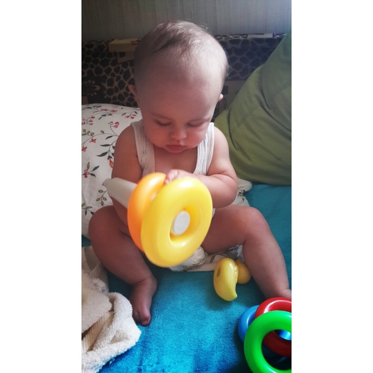 Какие мы уже взрослые,казалось недавно мы только водили у него перед носом погремушкой,для того чтоб он следил за ней взглядом,а теперь Сенька сам собирает свою первую пирамиду.Эх...