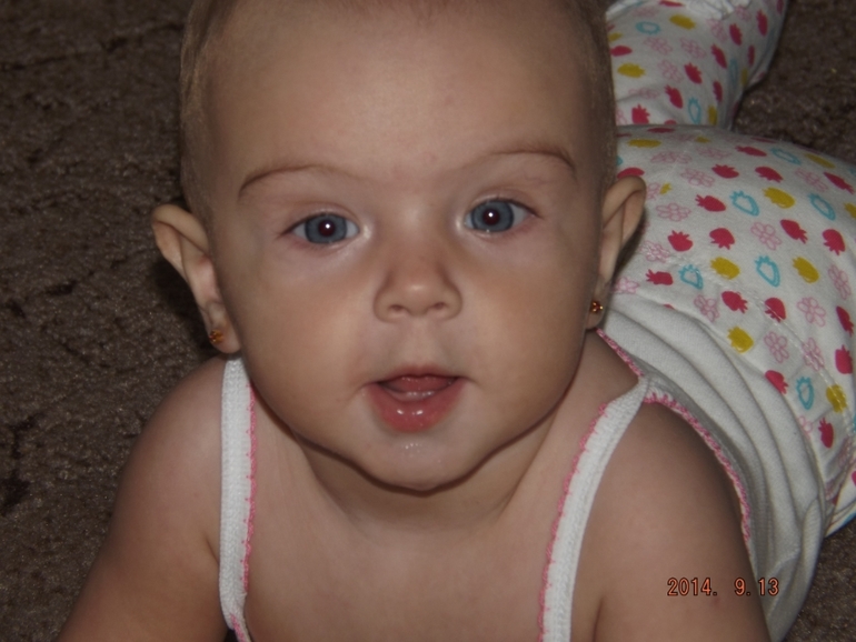 6. в 5 мес вылезли 2 нижних зуба,пока затишье поэтому за 3 дня до 6 мес прокололи ушки!!)))Все прекрасно ,ей не мешают,не беспокоят...