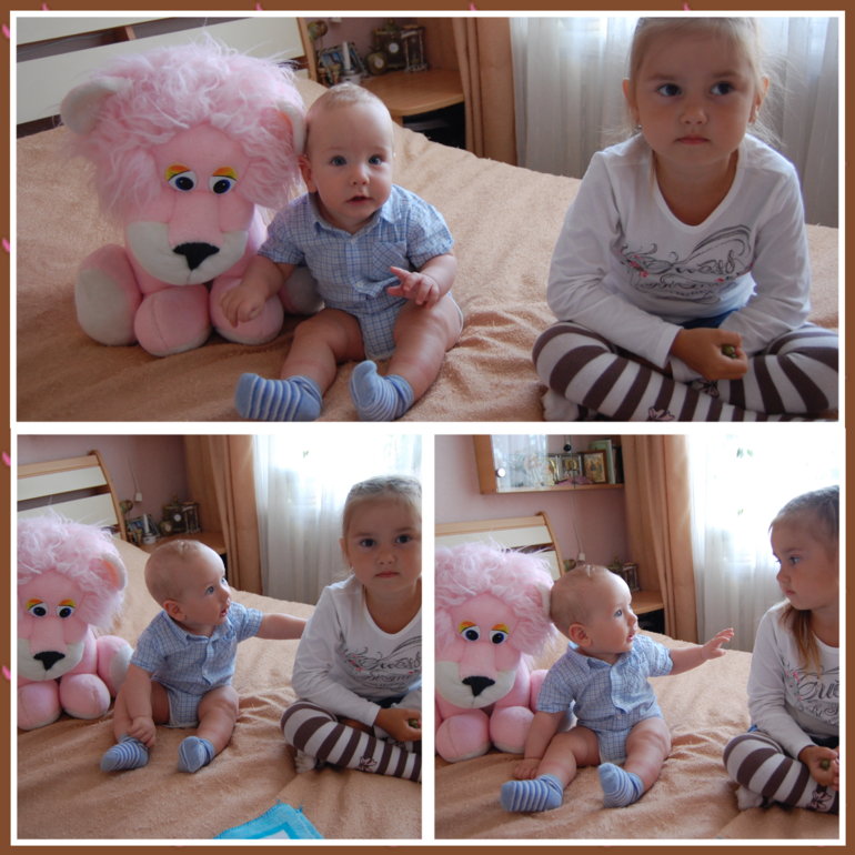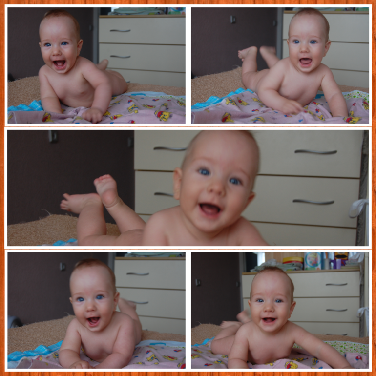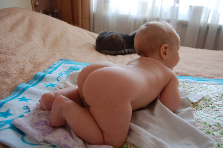 В 5 мес.и 24 дня Илья предпринял конкретные такие попытки к ползанию:поднимает попу,подтягивает коленки и отталкивается рывком,при этом руки тоже передвигает вперед.Самый наш любимый мотиватор к ползанию это мой мобильный телефон.Даже выключенный он всё равно сильно привлекает внимание сына.Никакая игруха так не манит как телефон и ПУЛЬТ! :)Вот эти предметы я передвигаю и Илюша тянется за ними.Вот над этой фоткой ржу))) Называется "У кого попа круче)))"