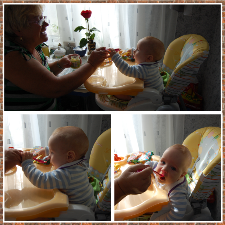 Кушаем мы мамино молочко,и за неделю до дня рождения начали кушать пюрешки.Об этом расскажу поподробнее.В 5мес.и 25 дней (5 сентября) мы впервые попробовали прикорм-кабачок.Я испытала бурю положительных эмоций и смеялась сама долго.Дело в том,что не знаю у кого как,но сын съев 2 ложки пюре даже не поморщившись требовал еще!Весь вытягивался в струнку с открытым ртом,стучал рукой по столику)))В итоге отнял ложку,облизал ее всю и начал стучать и ею тоже,требуя продолжения банкета)))Мне так совестно было,что я больше не дала,но нужно было проверить реакцию организма на новый продукт)))В настоящий момент мы свободно кушаем кабачок и цветную капусту,на днях будем вводить брокколи))) Кстати почетное право первой ложки пюре было предоставлено бабушке,от чего она тоже получила свой заряд позитива))