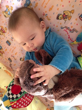 В свои 5 и 5 мы так и находимся в серединке норм развития - и не торопимся, и не сильно тормозим вроде. Через левый бок на живот - раз плюнуть. Через правый - никак. С живота на спину - не всегда получается, но стараемся отклячивать подальше пятую точку, чтобы получилось, бывает удается. Ползти - пока тока назад немного, после длительного усиленного отклячивания той самой точки. Руки работают слаженно и активно - все появляющееся в зоне видимости и доступности хватается и изучается с насупленными бровями. Примерно так.