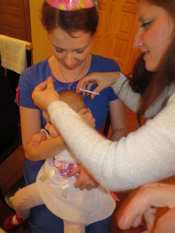 Крёстная церемониально срезала так называемый локон (вернее, что нашла, то и срезала). Его мы положили в баночку-копилочку вместе с пожеланиями, написанными гостями, и первой Ксюшиной соской. Откроем на 18-тилетие.