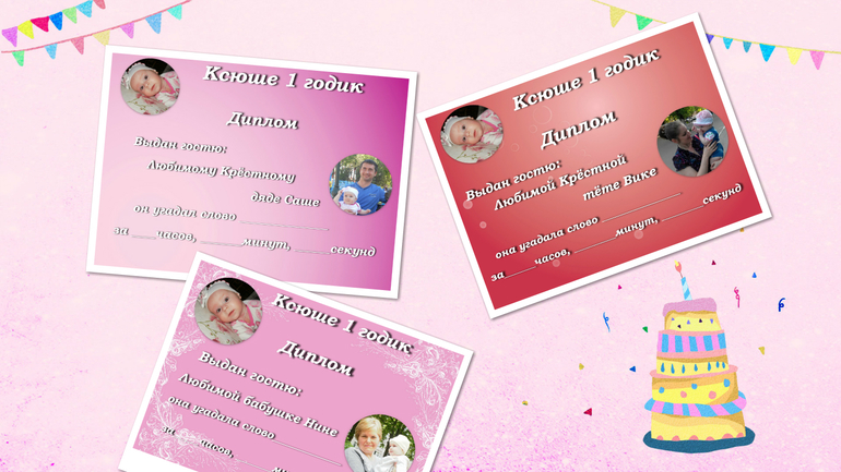 Удалось провести пару конкурсов. В первом участвовали все. Я подготовила 10 слов, названия вещей ребёнка. Слова распечатали, скрутили в трубочки и положили в детское ведёрко. Угадывающий отворачивался, а Ксюша доставала одну трубочку. Мы её разворачивали, молча читали и убирали. Угадывающему называлась только первая буква слова. Сложных слов не было, поэтому все были молодцами и получили именные дипломы от Именинницы