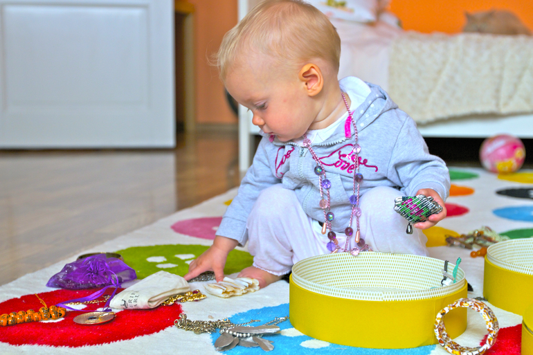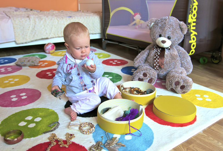 Ей нравятся блестящие побрякушки. Она перекладывает их из руки в руку, перебирает пальчиками, рассматривает.