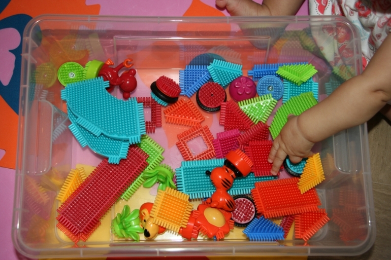ИгрыЯ не особо представляла, какой толк в сенсорной коробочке, когда у ребенка целая сенсорная квартира под рукой. Однако, оказалось, что толк есть! Ребенок чувствует габариты коробки, с интересом туда залезает ручками и что-нибудь вытаскивает. Те же детали, разбросанные вне коробочки, уже не так интересны ребенку.