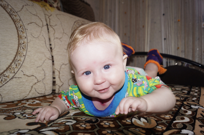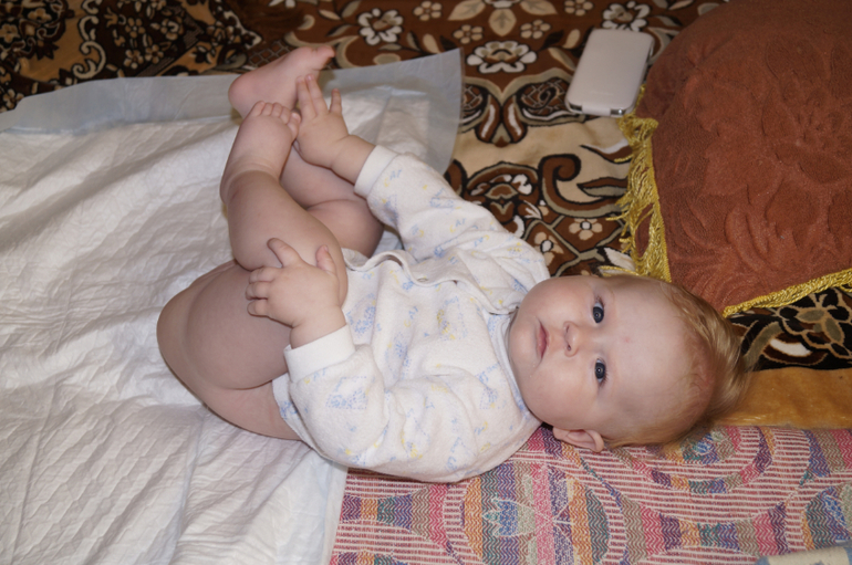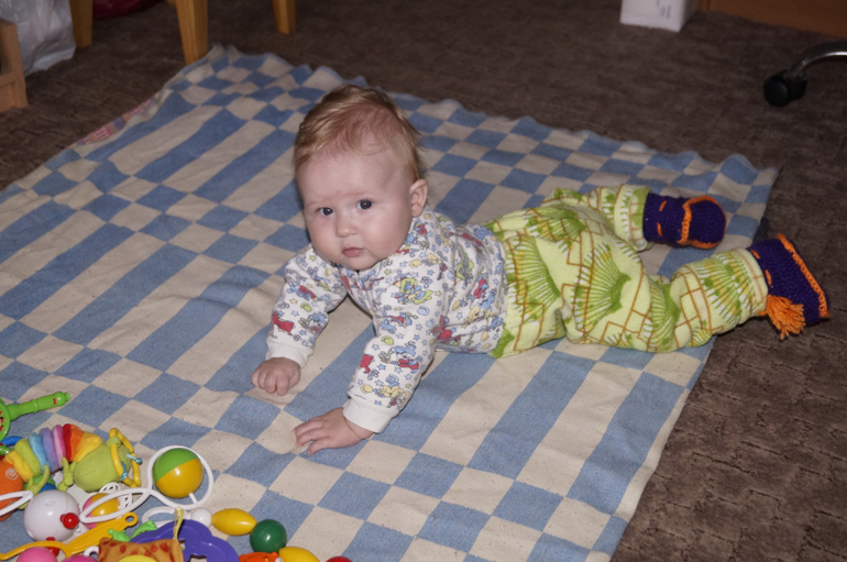 1. переворачиваться на живот ( пока только через правую сторону и с неохотой, т. к. положение лежа на животе до сих пор не облюбовано нами). Перевернётся, а потом начинает орать. Типа, кто посмел меня повернуть? Или .... Не знаю зачем мне это, но надо...