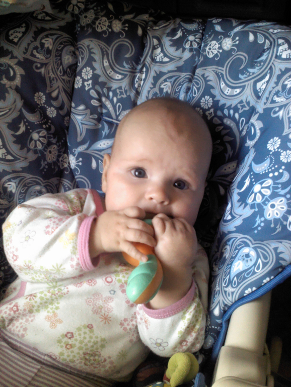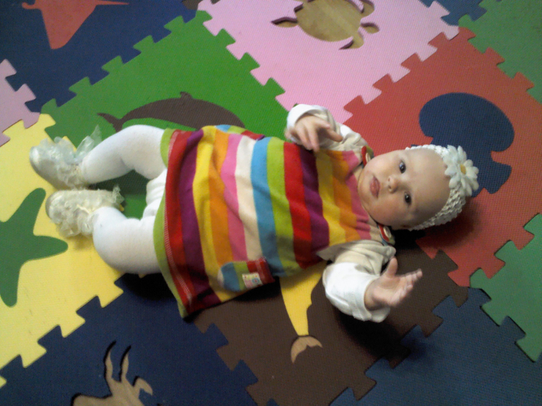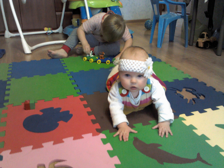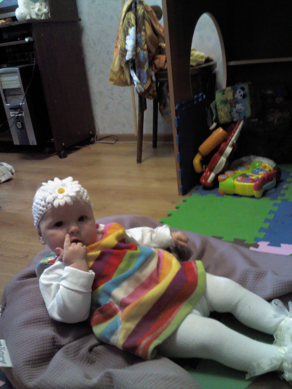 Зубов у Ниси пока нет, но слюни ручьем и в рот все тянет. Прикорм тоже пока не вводили, вот закончим курс массажа и попробуем, но ей пока мама нравится, особого интереса к пище я не вижу. давала побывать яблоко в нублере, но она больше наверное удивилась чем ей понравилось))Сидеть у нее не получается, но она старается. Ползает пока на животе и голове, только попу поднимает))) массажистка зовет ее страусенком))) потому что на голову встает, а попу поднимает))) Переворачивается во все стороны и передвигается по полу тоже перекатами с живота на спину, ну как умеет так и перемищается))) Очень любит играть с Тимошей и в игровом центре, он меня очень спасает, и вообще рада любому общению со стороны своих братьев. ВОТ ТАКАЯ ДЕВОЧКА У НАС!!!