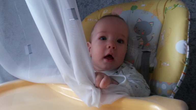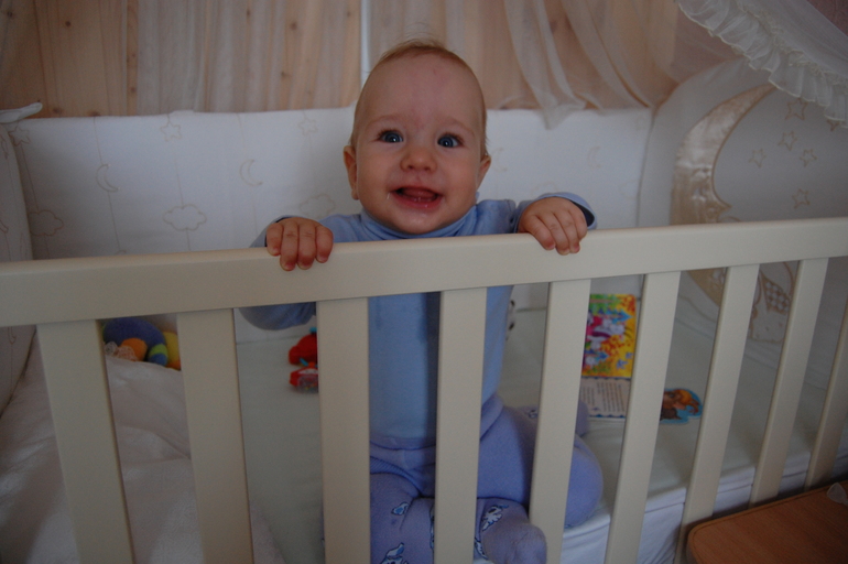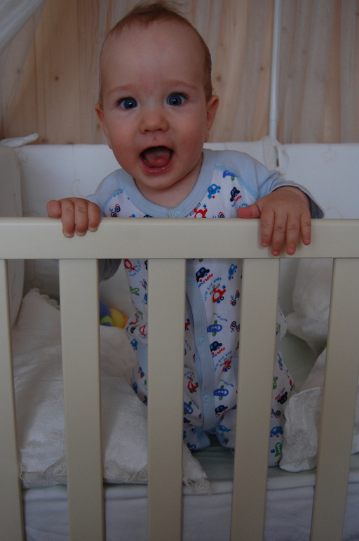 Еще Илюша стал подтягиваться в кроватке и сидеть на коленочках,ждать пока я приду на его зов))