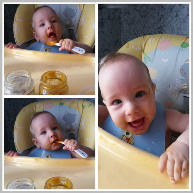 Кушаем мы утром кашу,пока ввели рисовую (очень любит),овсянку можем поесть,но совсем немного,как и гречку.В обед кушаем овощи,ввела цветную капусту,кабачок,брокколи,тыкву,морковь,картофель,вечером на полдник яблочко,грушку кушаем.От персика высыпали щечки,больше давать не буду.Но здесь нужно учитывать,что мы болели большую половину месяца,поэтому новые продукты не вводила,да и с насморком сыну введенные-то продукты трудно шли.