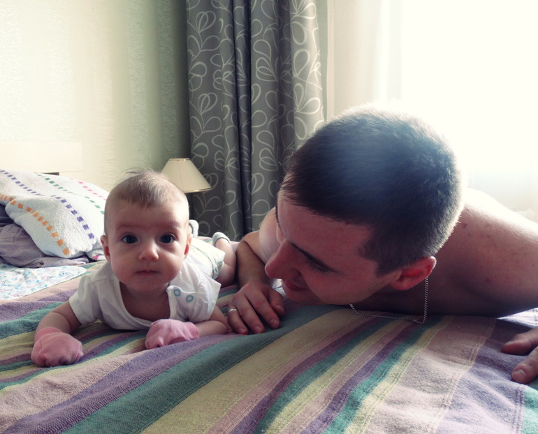 И вот сейчас я наблюдаю такую же ситуацию в нашей семье. Когда София с папой, то у них своя идиллия, они в каком-то своём мирке, играются, балуются, муж придумывает разные игры! Если я просто включу ей собачку(которая ездит), то он же посадит на неё остальных игрушек, которых она будет возить....будет подбрасывать её в воздухе, от чего малышка визжит! Он смотрит на неё влюблёнными глазами, обнимает, жмякает и им больше никто не нужен!