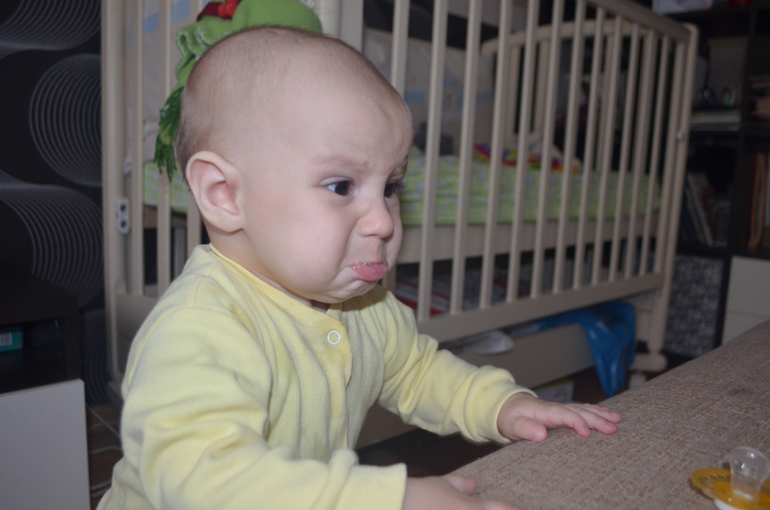 А еще с недавних пор когда Рома делает то что ему нельзя (например кошку кусает или тапки сосет) я ему говорю "Ромочка,нельзя,нельзя" (не ору а ласково-утвердительно говорю) и пальчиком махаю он на меня смотрит и тут же начинает кривить губу и хныкать)))Поросёнок мой любимый)