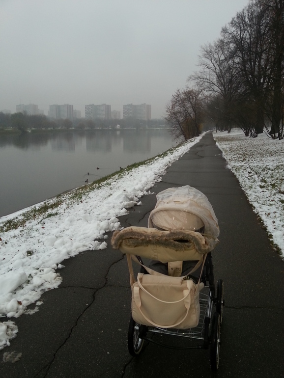 Долго выглядывала на улицу, собиралась с духом. И все же пошли! Раз перетерпели шквалистый ветер в субботу, то и это не помешает. Уж очень захотелось мне удивить сына первым снегом!