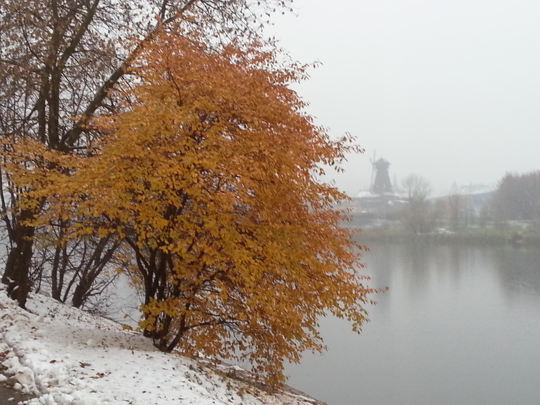 прудами. Над прудами туман (влажность как в бане). Морось, переходящая в дождь.Около нуля. Мы гуляем. Почти в одиночестве. Встретила одну две коляски и собачников.