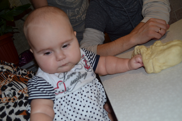 Настя долго сосредоточенно месила его (настолько серьезно, что даже не обращала внимание, когда ее звали!), пыталась оторвать кусочек и засунуть себе в рот (чего при прошлых занятиях не наблюдалась, но все когда-то бывает в первый раз), я была, конечно, наготове и не дала ей сожрать попробовать на вкус сырое тесто. Потом с ней поделились скалкой, которая также ей очень даже приглянулась. После 10 мин игры тесто у нее забрали и положили на противоположный от нее конец стола, дав ей взамен гору игрушек. Но ребенок по-иному расставил приоритеты и практически выпрыгнул с рук державшей его бабушки на стол!)) Пришлось вернуть) Вчера купила ей пластилин Плей До, посмотрим, понравится ли он ей... В ближайшее время напишу!