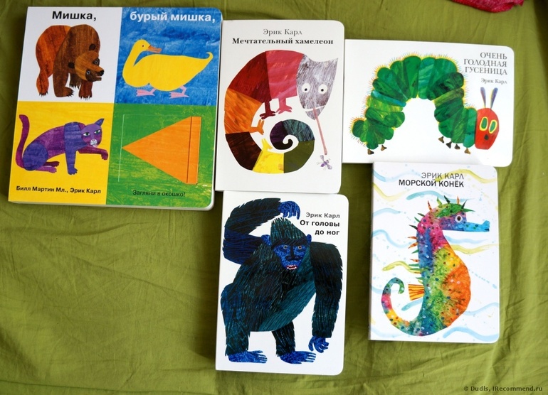 6. Книжки Эрика Карла. Дорогие, с толстыми картонными листами, и с престранными неклассическими иллюстрациями, они, прямо скажем, удивляют взрослых, но обожаемы детьми от 3 месяцев до 5 лет - проверено на собственном Ре и многочисленном детсаде подруг. Купила для пробы сначала одну, теперь же собрала почти всю коллекцию. Даня постоянно их мне тащит почитать, изучает заодно (и я в это верю!) цвета, формы, счет, всякую мораль и тд. Период грызни, который длился у нас примерно с 7 до 8 месяцев, книжки пережили отлично и стали основой нашей, надеюсь, в будущем грандиозной детской библиотеки.