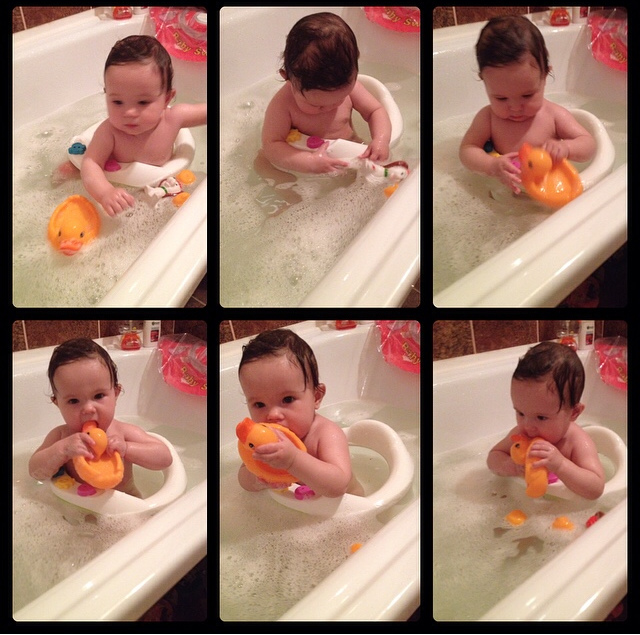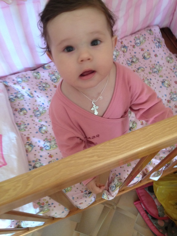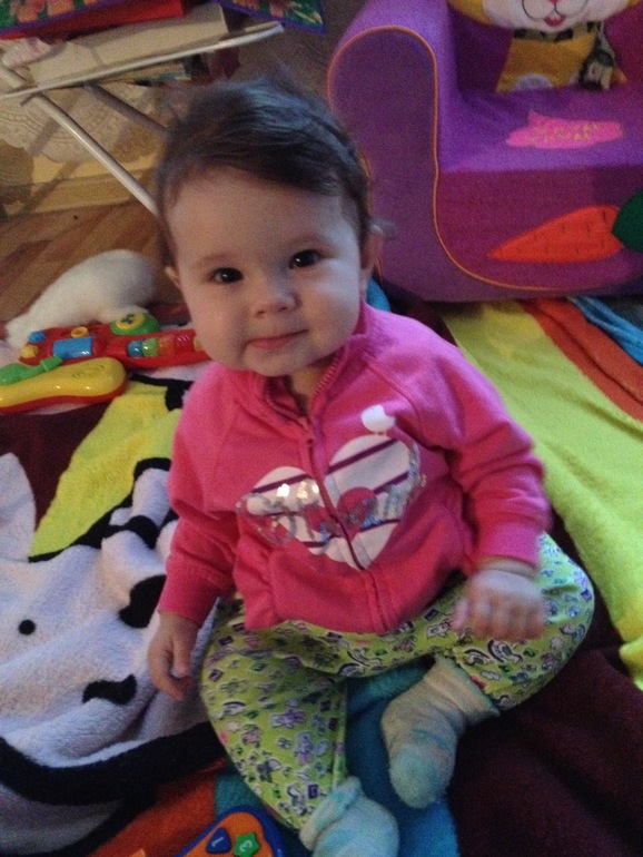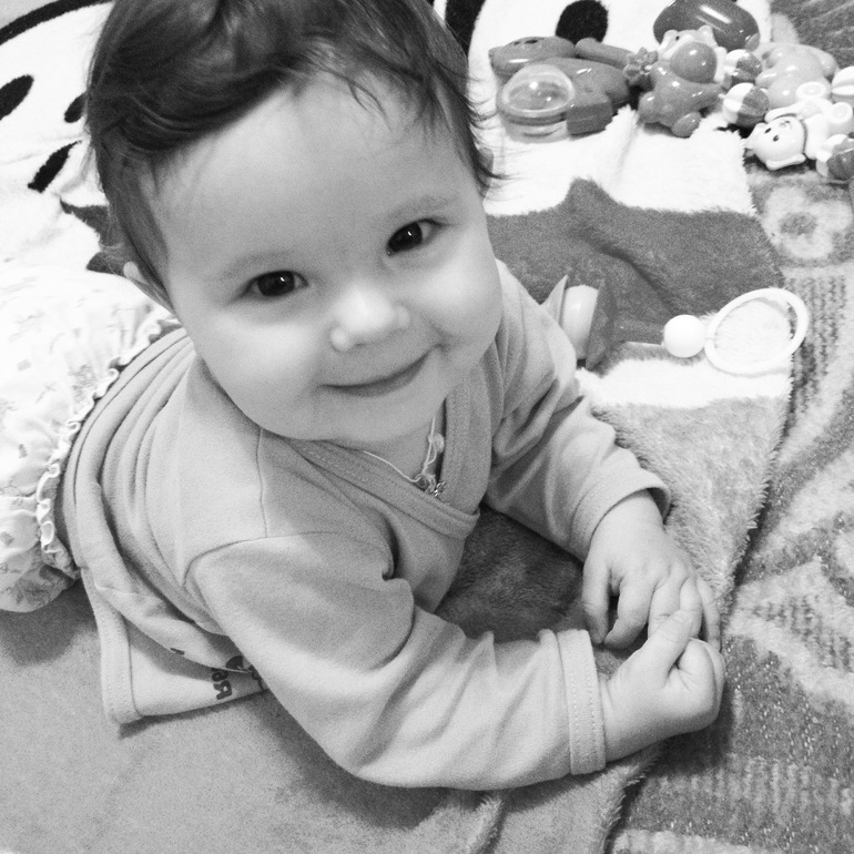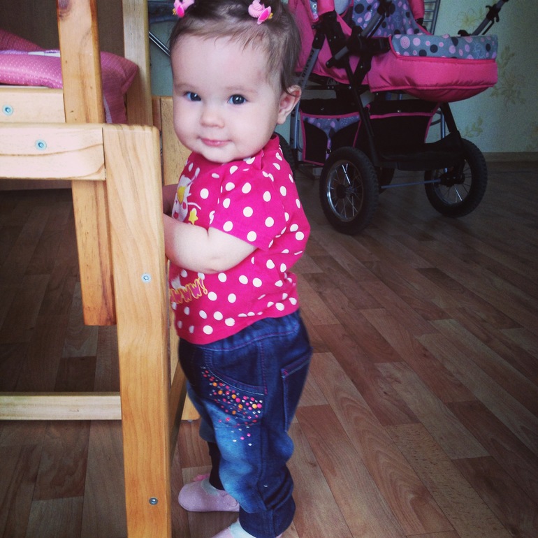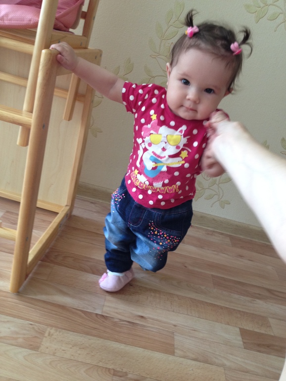 Как уже и говорила этот месяц у нас получился насышенный, Полина научилась сама садиться, я очень была этому рада , но с этим пришли проблемы с укладыванием, я около часа могу ее укладывать ,а она садиться и уползает... Наконец-то научилась ползать на четвереньках, до этого только по пластунски ползала.. Вылезли два верхних зуба,теперь моя крошка совсем зубастая)))) Стала хорошо встовать и стоять у опоры,даже уже и ходить стала держась за какую нибудь опору,растет моя девочка прям не по дням,а по чесам))) Самое главное научилась говорить мама, сидит играет на полу, и начинает мамкоть,до жути приятно слышать эти слова от своего ребенка))) Ладушки так играть и не научились , зато сколько радости даставляет играть в "дай пять"..