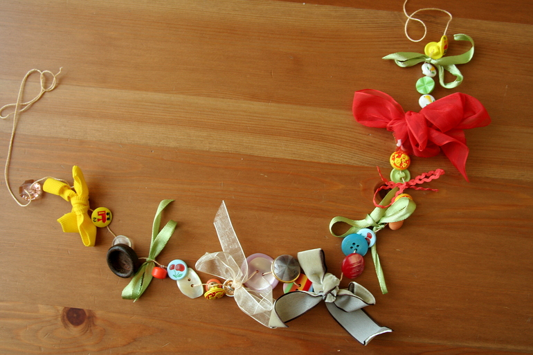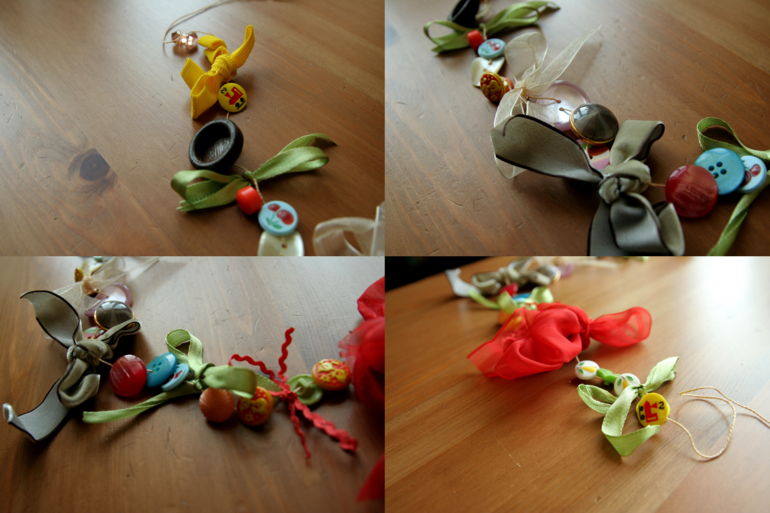 Я взяла огромную бабушкину коробку с пуговицами, некоторые из которых покупались еще для меня (так что по ходу дела меня охватила ностальгия). Нанизала эти пуговицы на веревку, но оказалось , что пуговицы как бы слипаются друг с другом. Поэтому я добавила бантики. С одной стороны, они служат разделителем между пуговицами, а с другой, они не позволяют всем пуговицам съехать вниз, когда закрепишь нитку на ручке автокресла.