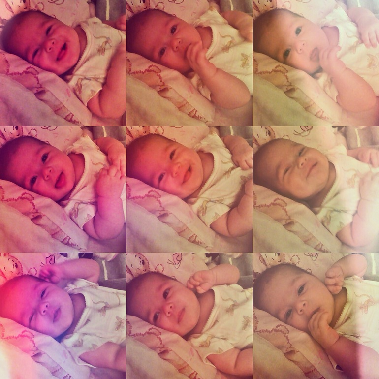 На сегодня мы умеем: держать голову, улыбаться, гулить, говорить "агу", "кхи", "Эува", "вава" и прочие милости, держать в лапке игрушку, смотрим на мобиль, купаемся в круге (но только на спине), держимся на локтях, ползаем лежа на спине (ага, и такое бывает), обращаем внимание на погремушки/звуки, нашли свои руки и теперь смотрим на них постоянно, хмурим бровки и развиваем мимику. Кстати переворачиваться она больше не хочет, видно тех 3-4 раз ей показалось достаточно.