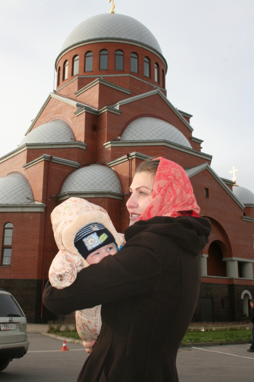25 октября в храме Сретения Господня. В наши ровно три месяца. Я сильно переживала, чтобы все прошло хорошо. Учитывая, что если Владик станет капризничать, что уже ничего кроме сиси его не успокоит, этого я и боялась. Но, все обошлось. Правда под самый конец он все-таки заплакал, когда Батюшка говорил напутственные речи. Поэтому по окончании церемонии мы мчались к машине, где Владюша с удовольствием покормился.
