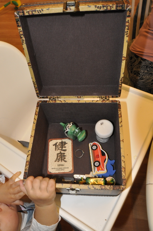 4. А потом поехали к моим родителям. Пока именинник спал свой единственный сон, с 12 до 3х, мы с мамой готовили и накрывали. Кроме такой тесной компании были еще мой брат с золовкой, остальным было отказано в связи с болезнью Ре. За столом мы говорили тосты, рассматривали книгу, вручали торт (Даня так и не понял, что это было) с свечкой - единичкой и выбирали судьбу. В коробку с "судьбами" я положила сплошь позитивные символы: здоровье, путешествие, жизнь в науке, море, автомобиль и тд. Мое чудо четко выбрал три вещи: творчество, путешествия и большую любовь, его выбором осталась очень довольна))) Все предметы были примерно одного размера и незнакомые, чтобы не получилось, что деть схватит любимую игрушку.