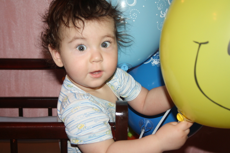 проснулся мой малыш и пока я осыпала его своими поцелуями папа заносил в комнату шары,сыночку они очень понравились и он так был счастлив,что просто пищал от восторга