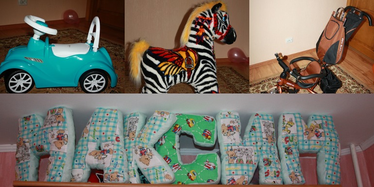 машинка-каталка,зебра-качалка,велик и мягкие буквы с именем сыночка