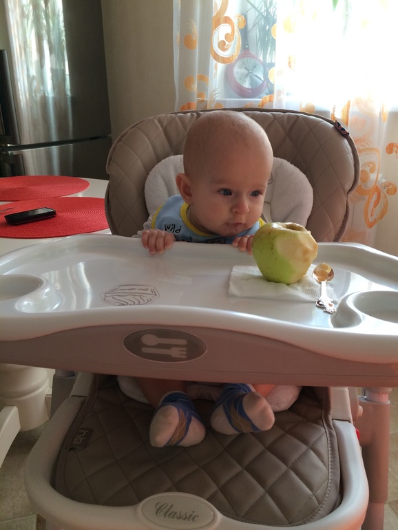 За неделю до 6 мес дала ему погрызть яблочко (но это конечно одно название, т к зубов у нас до сих пор нет!), ему так понравилось, что решила на следующий день ему ложечкой его поскребсти. Сейчас даю ему пюрешку яблочную вместо скобленого яблока и цветную капустку. Пока вроде бы все его устраивает и все нравится) с завтрашнего дня хочу дать кабачок! Так уже хочется всем его накормить!!! Наконец-то ко мне пришло это чувство, а еще буквально недели 2-3 назад я совершенно этого не хотела и боялась как и что будет.