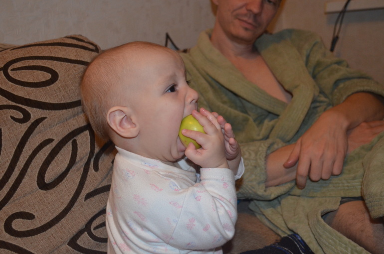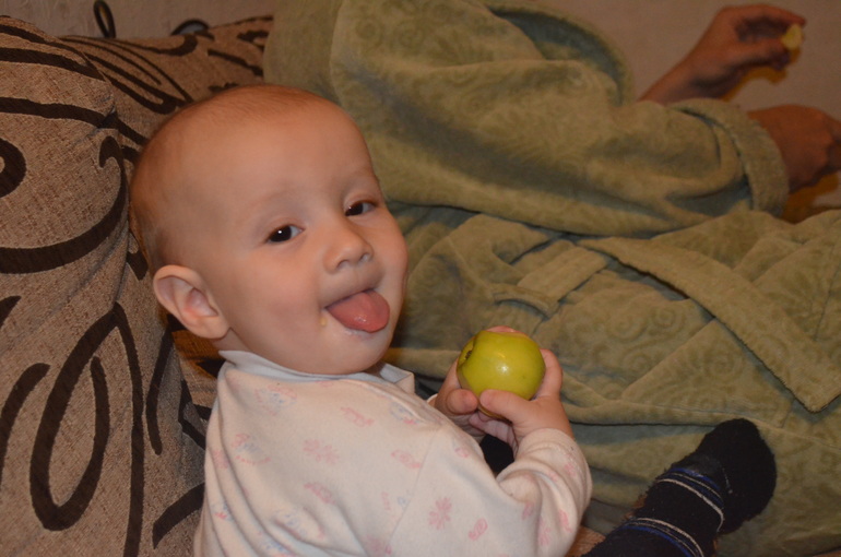 4.Не знаю почему,но Ромка так смешно кушает банан(на пробу ему дала чуток)-щурится но тут же потом открывает рот и просит еще)
