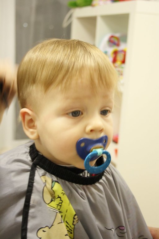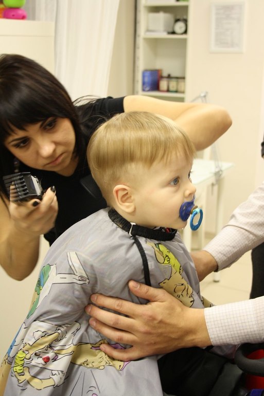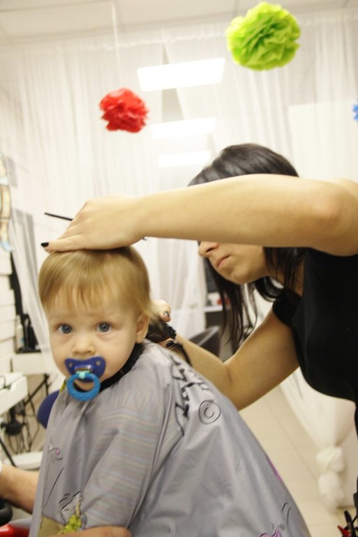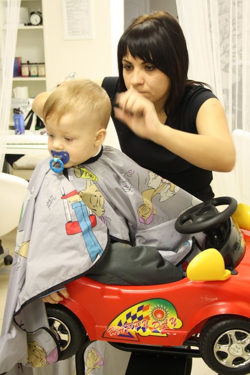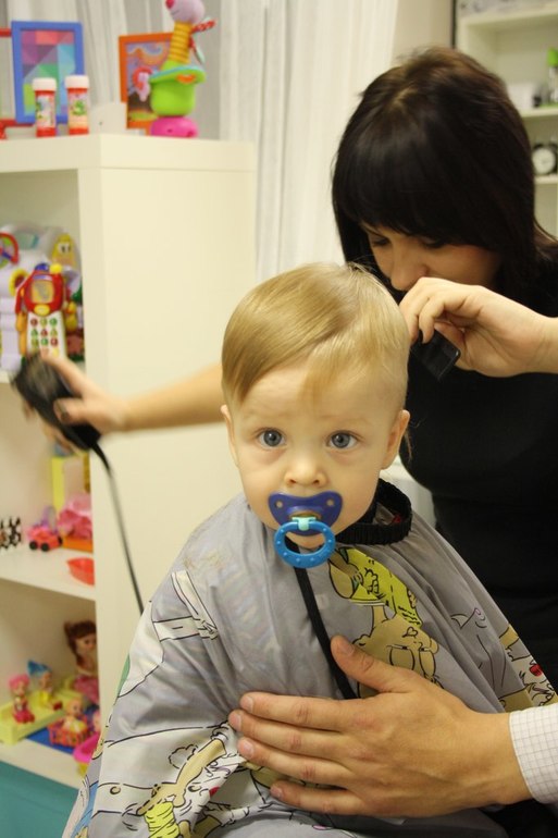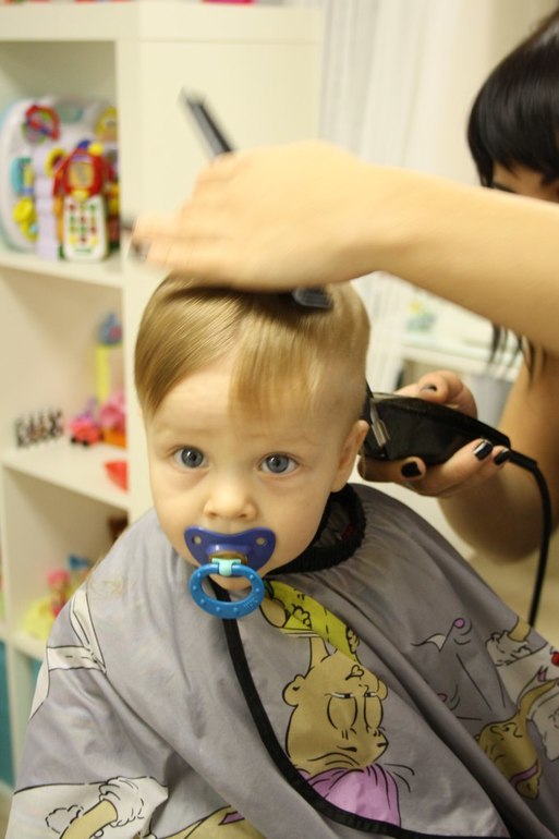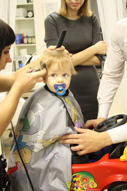 на удивление вёл себя спокойно, ни разу не заплакал, только иногда убирал руки парикмахера со своей головы)) Парикмахерская отличная, нам даже на память первые локоны положили в красивую коробочку и фото сделали бесплатно :) Мы с мужем очень довольны, теперь на свой годик, будет с новой стильной стрижкой;) только я забыла окончательный вариант дома сфоткать...ну выложу тогда уже фото с года в новом костюме и со стрижкой:)
