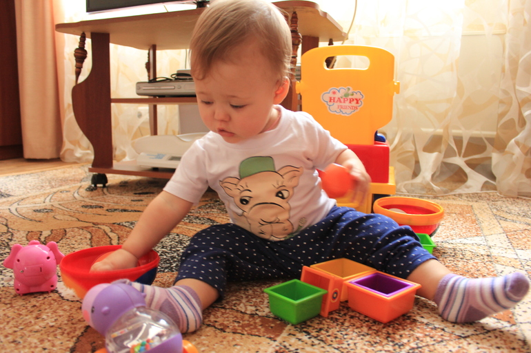 Играет самостоятельно, перебирает игрушки. Мелкие перекладывает, в сортер любит играть, пирамидки строить, с кнопками на игрушках разбирается.