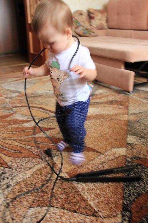 Начала все на себя примерять. В фаворе «провода». Все пытается на голову одеть, но почему-то все на плечах остается ))) Подходит к зеркалу и смотрит на себя, а потом целует)