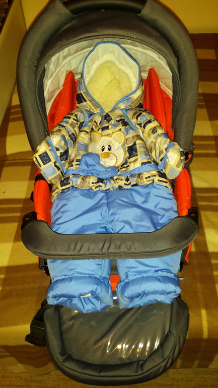 У меня конверт посвободнее, одна моська торчит, если весь застегнуть и затянуть.Пока не накрываю.Когда очень холодно было очень, шерстяным пледом прикрывала.Я просто под низ пока не одеваю теплое под комбез ничего, у нас кери теплый.А потом поддеву буду еще одевать.