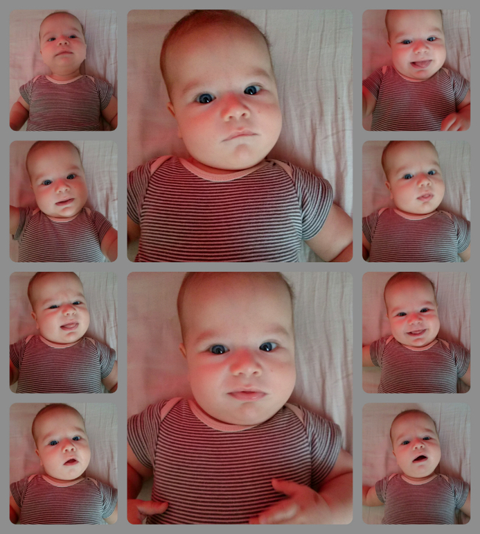 Агукает, улыбается, смеется... Особенно меня прикалывает, когда пеленаю его, на комоде стоит упаковка ватных тампонов с нарисованным женским лицом. Так он ей улыбается и смеется даже чаще чем мне