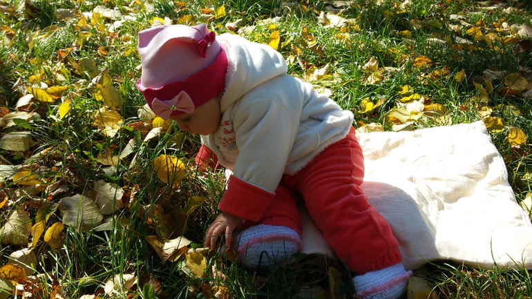 Активно ползаем, стоим и ходим у дивана или у какой-нибудь опоры) научились играть в ку-ку, София натягивает на голову себе пеленку или, что попадется под ручки, а потом выглядывает, и ждет когда же ей скажут - ку-ку))))) в сороку играть мы не очень любим, вырываем ручки и ползем заниматься своими делами, скучно для нас, а вот в ладушки иногда играем, особенно любит поднимать ручки на головку- полетели на головку сели))))