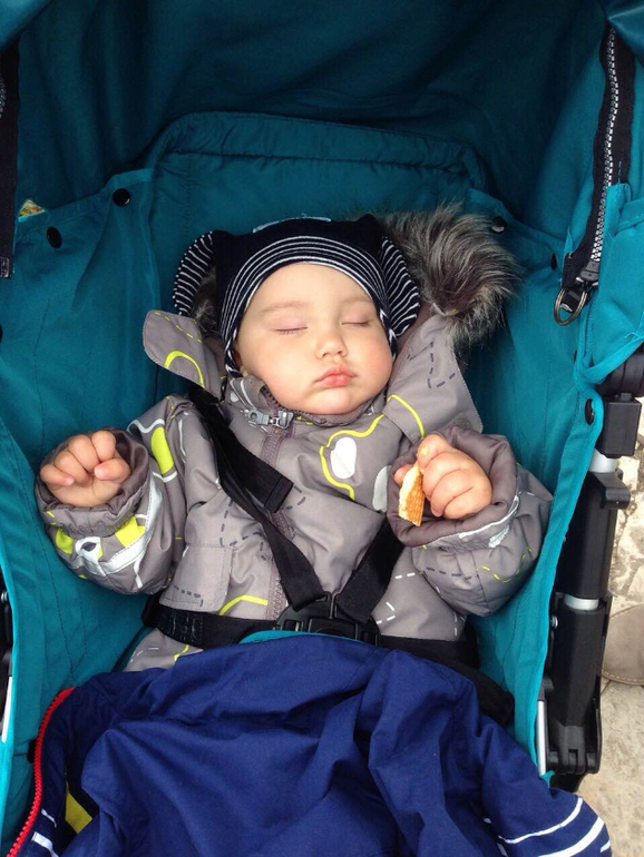 Так утомили ребенка, что заснул, не доев свою печеньку: