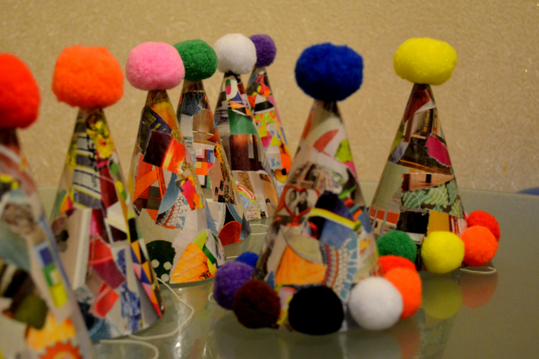 ☆ Сделала колпачки. Выделила колпачки именинников декором. Все смотрятся мило, каждый неповторим. Цвет попмпона выбранного гостем колпачка определяет цвет прочих мелочей: помпона на чашку (чтобы знать, где чья) и т.д.