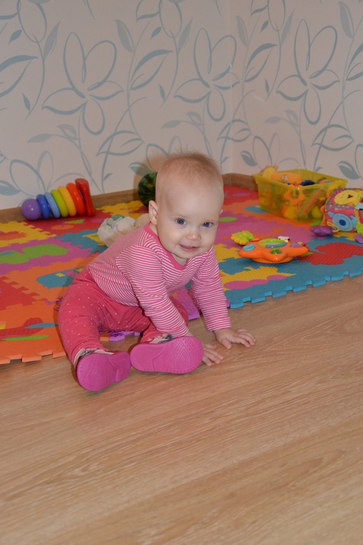 - ползает хорошо, быстро, очень любит везде вставать, от любой опоры, даже стены, и легко садиться сама на пол с них, может пройти вдоль дивана или с опоры на опору, за ручки чуть протопать.